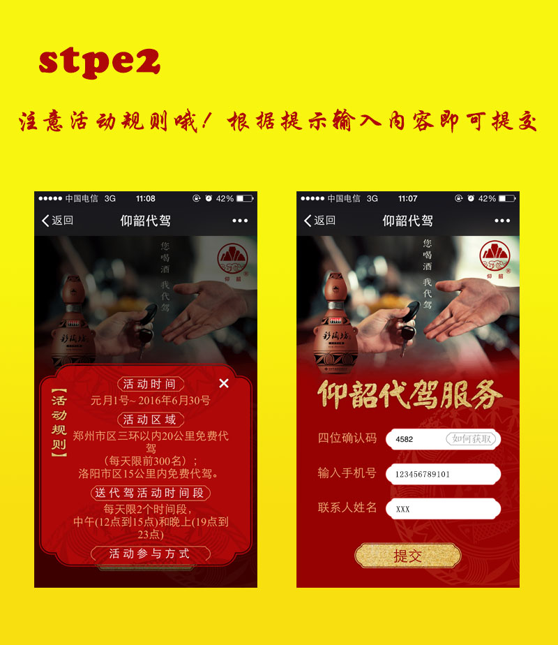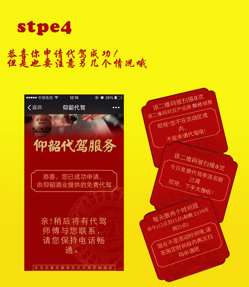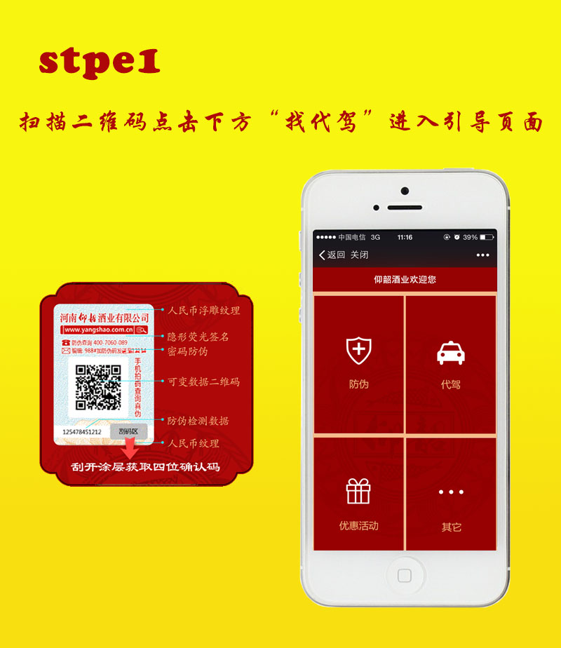 仰韶酒业“你喝酒我代驾“活动!活动期间,购买仰韶指定款白酒,即可通过扫描二维码获取免费代驾的机会。