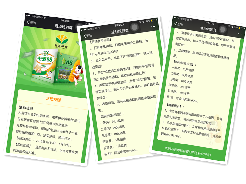 屯玉种业做为国内种业龙头企业之一,与华信瑞德联合,在种业行业率先应用了扫描二维码送话费和发红包的活动。