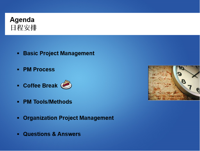 培训内容主要涉及项目管理的起源与发展、项目管理的基本概念和相关知识领域、项目管理流程与项目中人员职责划分、项目管理的实用工具及结合具体项目讨论了项目中遇到的实际问题。